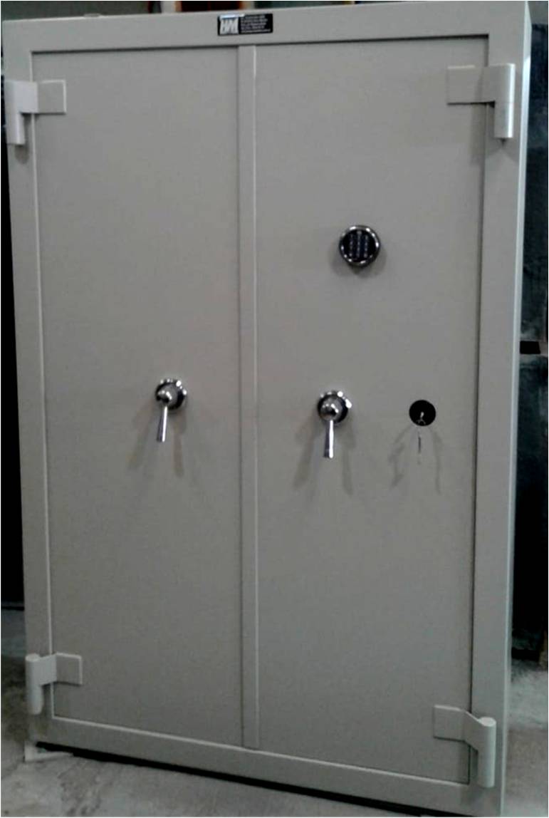 Con una cerradura a llave doble paleta doble vuelta de seis combinaciones laminares y dos electrónicas o mecánicas con tiempo e retardo programable.